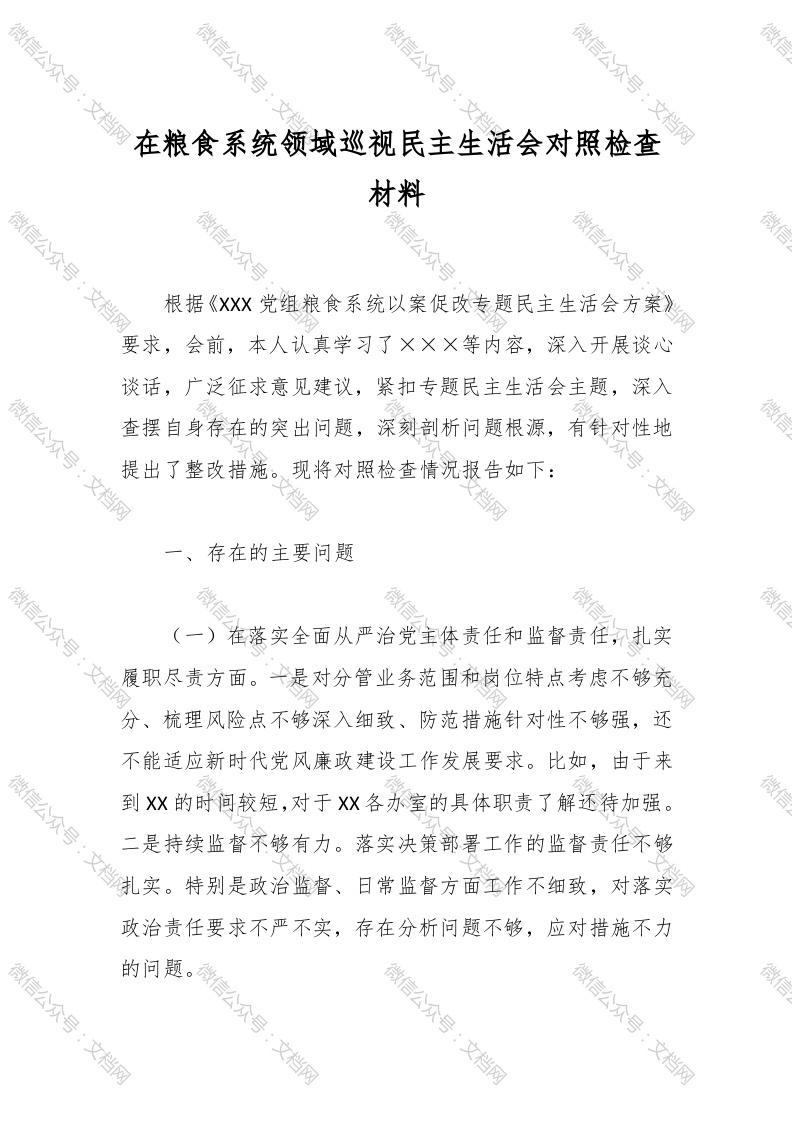 微信公众号:文档网微信公众号微信公众号微信公众号:文档网信粮食系统领域巡视民主生活会对照检查微信公众号:文档网微信公众号微信公众号微信公众号微信求,会前,本人认真学习了×××等内容,深入开展谈心谈话,广泛征求意见建议,紧扣专题民主生活会主题,深入微信公众号查摆自身存在的突出问题,深刻剖析问题根源,有针对性地信众文档网提出了整改措施。现将对照检查情况报告如下::文档网一、存在的主要问题微信公众号:文档网微信微信微信(一)在落实全面从严治党主体责任和监督责任,7扎实、梳理风险点不够深入细致、防范措施针对性不够强,还不能适应新时代党风廉政建设工作发展要求。比如,由于来微信公众号到XX的时间较短,对于X各办室的具体职责了解还待加强。二是持续监督不够有力。落实决策部署工作的监督责任不够政治责任要求不严不实,存在分析问题不够,应对措施不力微信公众号:文档网的问题。微信公众号文档佩微信公众号:文档网微信公众号:文档网