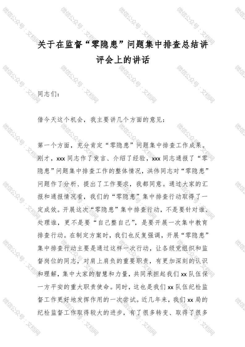 微信公众号微信公众号微信公众号文评会上的讲话微信公众号:文档网微信公众号:文档网微信公众号:文档网微信公众号:文档网微信志们:借今天这个机会,我主要讲几个方面的意见:微信公众微信公第一个方面,充分肯定“零隐患”问题集中排查工作成果。隐患”问题集中排查工作的整体情况,洪伟同志对“零隐患”微信公众号:文档问题作了分析、提出了工作要求,我都同意。通过大家的汇报和通报情况看,我们的“零隐患”集中排查行动取得了一处理谁,更不是要“自己整自己”,是要开展一次集中教育排查行动。在制定方案时,我们也反复强调,开展“零隐患”集中排查行动主要是通过这样今次行动,让各级党组织和监督岗位的同志,对肩上肩负的重要职责,有更加深刻的认识一方平安的重大职责使命。同时,这也是我们x队伍纪检监督工作更好地发挥作用的一次尝试。近几年来,我们x局的微信公众号:文档网纪检监督工作取得较大的进步,有了很多转变、取得了很多文档网文档网文档网