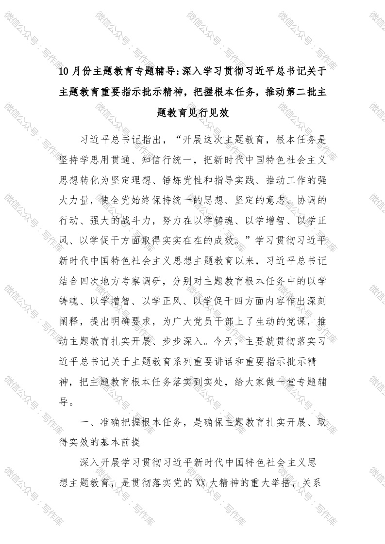 微信公众号微信公众号:写作微信公众号:写作库主题教育重要指示批示精神,把握根本任务,推动第二批主微信公众微信公众号微信题教育见行见效习近平总书记指出,“开展这次主题教育,根本任务是思想转化为坚定理想、锤炼党性和指导实践、推动工作的强微信公众号:写作大力量,使全党始终保持统的思想、坚定的意志、协调的行动、强大的战斗力,努力在以学铸魂、以学增智、以学正、以学促干方面取得实实在在的成效。”学习贯彻习近平新时代中国特色社会主义思想主题教育以来,习近平总书记结合四次地方考察调研,分别对主题教育根本任务中的以学铸魂、以学增智、以学正风、以学促干四方面内容作出深刻阐释,提出明确要求,为广大党员干部上了生动的党课,推近平总书记关于主题教育系列重要讲话和重要指示批示精神,把主题教育根本任务落实到实处,给大家做堂专题辅微信公众号:写作库导。公众号众号公众号实效的基本前提深入开展学习贯彻习近平新时代中国特色社会主义思微信公众号:写作库想主题教育,是贯彻落实党的X大精神的重大举措,关系:写作库:写作库众号:写作库
