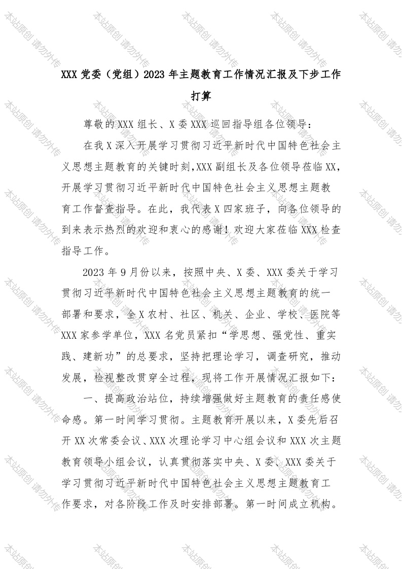 本站原创请勿外传本站原创请勿外传本站原创请勿外传本站原创请勿外传本站原创请Xx党委(党组)2023年主题教育工作情况汇报及下步工作打算本站原创请勿外传本站尊敬的XXX组长、X委XXX巡回指导组各位领导:在我X深入开展学习贯彻习近平新时代中国特色社会主义思想主题教育的关键时刻,XXX副组长及各位领导苍临XX,开展学习贯彻习近平新时代中国特色社会主义思想主题教本站原创请勿外传育工作督查指导。在此,我代表X四家班子,向各位领导的本站原创请勿来表示热烈的欢迎和衷心的感谢!欢迎大家莅临X检查导工作。2023年9月份以来,按照中央、X委、XXX委关于学习本站原创请勿外传贯彻习近平新时代中国特色社会主义思想主题教育的统一部署和要求,全X农村、社区、机关、企业、学校、医院等XX家参学单位,XXX名党员紧扣“学思想、强党性、重实践、建新功”的总要求,坚持把理论学习,调查研究,推动发展,检视整改贯穿全过程,现将工作开展情况汇报如下:一、提高政治站位,持续增强做好主题教育的责任感使本站原创请开XX次常委会议、XXX次理论学习中心组会议和XXX次主题本站原创请教育领导小组会议,认真贯彻落实中央、X委XXX委关于学习贯彻习近平新时代中国特色社会主义思想主题教育工本站原本站原本站原本站原创请勿外传本站原创本站原创请勿本站原创ク本站原创请勿立以X委书记为组长的工作领导水组,建立部门联席制度,派出X委常委任组长的XX个巡回指导组,分别对X家单位、XXX个XXX开展主题教育巡回指导,确保全X主题教育工作本站原创请勿外传有序推进。第一时间制定方案。按照《XXX开展学习贯彻习近平新时代中国特色社会主义思想主题教育实施方案》要求,X家单位、XX个XXX在XX月XX日前全部制定完成主题教育实施方案。第一时间动员部署。XX月X日全X主题教育本站原创请勿外传工作会议召开后,各级基层党组织在一个星期内全部召开工作启动会议,对主题教育工作进行全面安排部署,形成一周本站原创请勿汇报,一周一调度,一周一安排的工作机制。二、严格标准要求,全面抓实抓细理论学习教育广泛覆盖全部领域。及时制定集中学习研讨方案,明确学习任务、学习内容、学习方式,重点在读原著、学原文、悟原理上下实等重点工作,扎实开展集中学习研讨。截至目前,X委理论学习中心组专题学习研讨XX次,各级党组织全部完成XX集中学习研讨任务。调研课题突出“实”字。根据集中学习本站原创请群众最期盼的问题作为调研重点,结合XXX和各自岗位职责,有针对性地确定调研课题。调研课题确定后,领导班子成员本站原创请勿外传带着各自的调研课题,深入农村、机关、学校、企业了解掌本站原创请握第一手资料,并注重务实管用,坚持结果导向,不发通知、本站原本站原本站原本站原本站原创请勿外传本站原创请勿本站原创请勿本站原创请勿本站原创请勿打招呼、不听汇报、不用陪同接待、直奔基层、直插现场开展调研,确保取得一手资料。注重抓细检视问题,印发《X委常委会征求意见表》,向全X广大干部群众征求X委常委本站原创请勿外传会和常委会班子成员意见和建议,并在微信公众号、门户网站设立征求意见专区,动员广大党员干部职工发动身边群众,通过互联网征求意见建议。注重抓牢整改落实。根据工作要求各专项整治专班牵头单位分别拟定专项整治子方案。重点本站原创请勿外传针对XXX的问题、关系XXX方面突出的问题,建立工作台账,通过问题整改转变工作作风,锤炼担当意识,提高担当能力,本站原创请勿履职担当中践行初心使命。三、紧密结合发展,持续强化推动中国是现代化XX新本站原创请勿外篇章高质量发展的质效。主题教育开展以来,全X各级各部门自觉践行全心全意为人民服务的根本宗旨,推出一系列便民利民新举措,为民谋利、为民尽责,从群众希望的事情做起,疏通堵点,攻克难点,使便民服务水平在主题教育中得本站原创请勿外到提升。通过专项整改解决群众长期反映烦心的道路、饮水等民生事项XX件,化解矛盾问题XX件。在主题教育期间,本站原创请涌现出XXX、XX、XX先进典型。截止目前,XXX主题教育相关信息在新华社、共产党员网、XX等国家级媒体刊登X条(次),XXX日报、XXX广播电视台X级媒体刊播XX条(次),本站原创请勿外传XXX日报、XX党建等XXX级宣传平台刊登XX条次),在本站原创请勿本站原本站原本站原