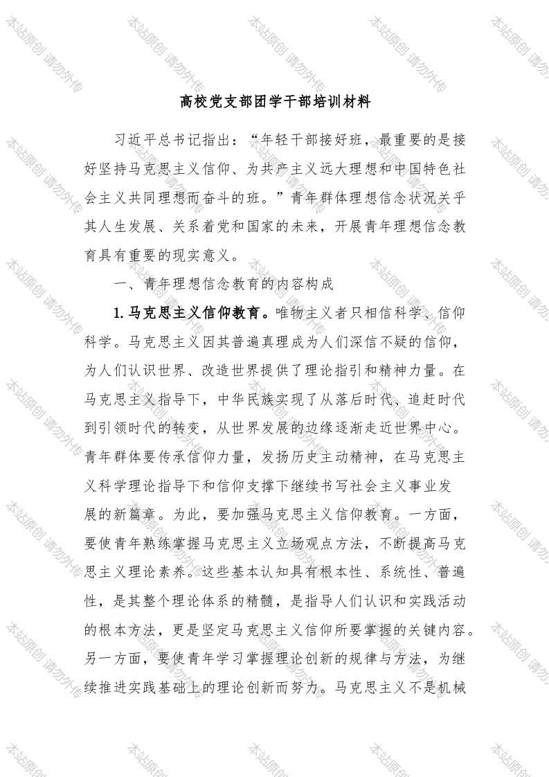 本站原创请勿外传本站原创请勿外传本站原创请勿外传本站原创请勿外传本站原创请勿校党支部团学干部培训材料习近平总书记指出:“年轻干部接好班,最重要的是接本站原创请勿外传好坚持马克思主义信仰、为共产主义远大理想和电国特色社主义共同理想而奋斗的班。”青年群体理想信念状况关乎其人生发展、关系着党和国家的未来,开展青年理想信念教育具有重要的现实意义。本站原创请勿外传一、青年理想信念教育的内容构成本站原创本站原创请勿1.马克思主义信仰教育。唯物主义者只相信科学信仰科学。马克思主义因其普遍真理成为人们深信不疑的信仰,为人们认识世界、改造世界提供了理论指引和精神力量。在本站原创请勿外传马克思主义指导下,中华民族实现了从落后时代,追赶时代到引领时代的转变,从世界发展的边缘逐渐走近世界中心。年群体要传承信仰力量,发扬历史主动精神,在马克思主义科学理论指导下和信仰支撑下继续书写社会主义事业发本站原创请展的新篇章。为此,要加强马克思主义信仰教育。一方面,要使青年熟练掌握马克思主义立场观点方法,不断提高马克性,是其整个理论体系的精髓,是指导人们认识和实践活动本站原创请勿外传的根本方法,更是坚定马克思主义信仰所要掌握的关键内容。另一方面,要使青年学习掌握理论创新的规律与方法,为继本站原创请勿续推进实践基础上的理论创新而努力。马克思主义不是机械本站原本站原本站原本站原创请勿外传本站原创请本站原创请本站原创勿本站原创请勿、教条的,而是开放的、发展的理论体系。坚定马克思主义信仰内在地蕴含了要以科学的态度对待马克思主义、发展马克思主义的要求,否则就不是真正的马克思主义信仰者。本站原创请勿外传2.共产主义远大理想教育。马克思站在无产阶级立场上,对人类社会发展趋势作出必将走向共产主义的判断。马克思主义理论的最终旨趣就是实现这一崇高理想。一百多年来,党不忘初心,始终以马克思主义为根本指导思想,把实现共本站原创请勿外传产主义作为月标追求,号召并引领一代又一代青年为之奋斗。立足新时代,户大青年要接好共产主义远大理想的班,传承本站原创请勿先辈遗志。旗帜鲜明地反对共产主义“渺茫论”,是进行共产主义远大理想教育的现实要求。共产主义远大理想崇高而远大,其实现不可能一蹴而就,需要长期的奋头过程。“如果大家都觉得这是看不见摸不着的东西,没有必要为之奋斗建立牢固的唯物史观,筑牢共产主义理想的理论根基,立志本站为实现这云美好愿景而持续奋斗。3.中国特色社会主义共同理想教育。中国特色社会主义本站原创请现共产主义远大理想而结合中国客观实际形成的阶段性目标。坚定马克思主义信仰和共产主义远大理想具象表现为坚本站原创请勿外传定中国特色社会主义共同理想。要进行中国特色社会主义共本站原创请勿理想教育,使青年正确认识中国特色社会主义的“前世今本站原本站原本站原本站原本站原创请勿外传本站原创本站原创请勿本站原创请勿本站原创请生”,在实践中坚守中国特色社会主义共同理想。改革开放前后两个历史时期都是围绕如何建设发展社会主义展开的。社会主义建设时期的探索实践为改革开放后的中国特色社本站原创请勿外传会主义发展奠定了物质基础、提供了经验教训。中国特色社主义是在历吏的发展进程中螺旋式上升的,没有社会主义建设时期的探索,也就不可能有今天的中国特色社会主义,后者是对前一个历史时期形成的有益成果的坚持与完善。中本站原创请勿外传国特色社会主义来之不易,青年群体要坚定“四个自信”,做中国特色社会主义的忠诚信奉者。请勿外传本站原创请二、青年理想信念教育的基本思路1.以科学理论的认同来支撑理想信念的树立。理论上清醒,政治上才能坚定。进行理想信念教育,要从马克思主义的科学理论中汲取营养。对科学理论的认同越深刻,支撑理“理想信念的确立,是一种理性的选择,而不是一时的冲动,本站原创请勿外光有朴素的感情是远远不够的,还必须有深厚的理论信仰作支撑,否则有风吹草动就会发生动摇。”一方面,牢牢掌本站原创请握马克思主义的科学所在。广大青年要更加自觉地运用马克思主义及其中国化时代化的理论成果武装头脑。对这些理论理解掌握的程度直接关系着信仰的确立与坚定。,没有对这些本站原创请勿外付理论成果的认同与接受,就不可能将其内化为坚定不移的信本站原创请勿念。另一方面,旗帜鲜明地反对各种非主流言论。意识形态本站原本站原本站原本站原