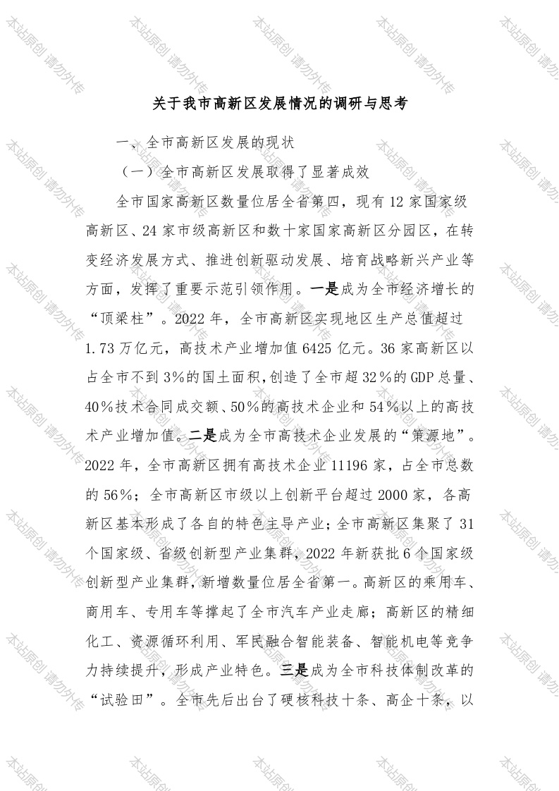 本站原创请勿外传本站原创请勿外传本站原创请勿外传本站原创请勿外传本站原创请勿关于我市高新区发展情况的调研与思考全市高新区发展的现状本站原创请勿外传(一)全市高新区发展取得了显著成效本站原创全市国家高新区数量位居全省第四,现有12家国家级高新区、24家市级高新区和数十家国家高新区分园区,在转变经济发展方式、推进创新驱动发展、培育战略新兴产业等本站原创请勿外传方面,发挥了重要示范引领作用。一是成为全市经济增长的“顶梁柱”。2022年,全市高新区实现地区生产总值超过.73万亿元,高技术产业增加值6425亿元。36家高新区以占全市不到3%的国土面积,创造了全市超32%的GDP总量、40%技术合同成交额、50%的高技术企业和54%以上的高技术产业增加值。二是成为全市高技术企业发展的“策源地”。的56%;全市高新区市级以上创新平台超过2000家,各高本站原创请勿外新区基本形成了各自的特色主导产业;全市高新区集聚了31个国家级、省级创新型产业集群,2022年新获批6个国家级本站原创请创新型产业集群,新增数量位居全省第一。高新区的乘用车、商用车、专用车等撑起了全市汽车产业走廊;高新区的精细本站原创请勿外传化工、资源循环利用、军民融合智能装备、智能机电等竞争力持续提升,形成产业特色。三是成为全市科技体制改革的“试验田”。全市先后出台了硬核科技十条、高企十条,以本站原本站原本站原本站原