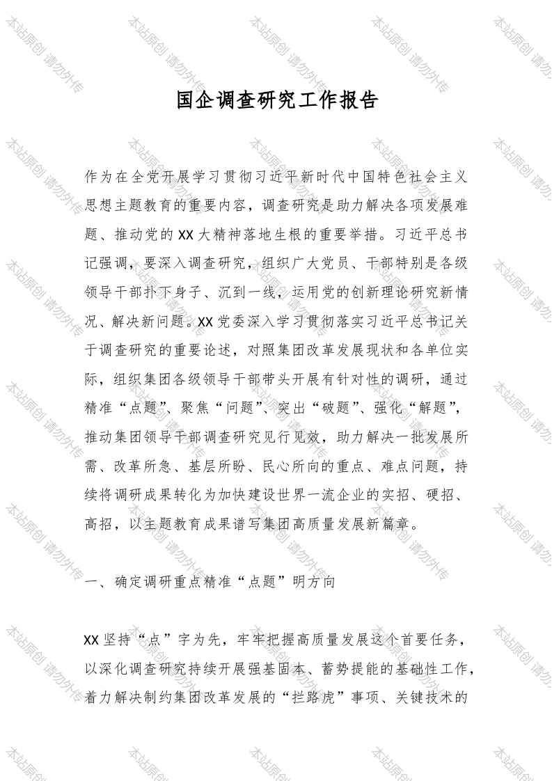 本站原创请勿外传本站原创请勿本站原创请勿外本站原创请勿外传本站原创请国企调查研究工作报告本站原创请勿外传本站原本站作为在全党牙展学习贯彻习近平新时代中国特色社会主义想主题教育的重要内容,调查研究是助力解决各项发展难题、推动党的X大精神落地生根的重要举措。习近平总书记强调,要深入调查研究,组织广大党员、部特别是各级本站原创请勿外传领导干部扑豕身子、沉到一线运用党的创新理论研究新情、解决新问题。X党委深入学习贯彻落实习近平总书记关于调查研究的重要论述,对照集团改革发展现状和各单位实际,组织集团各级领导干部带头开展有针对性的调研,通过本站原创请勿外传精准“点题”、聚焦“问题”、突出“破题”、强化“解题”,本站原创请勿动集团领导干部调查研究见行见效,助力解决一批发展所、改革所急、基层所盼、民心所向的重点、难点问题,持续将调研成果转化为加快建设世界一流企业的实招、硬招、高招,以主题教育成果谱写集团高质量发展新篇章。请勿タ请勿タ请勿外传本站原创请确定调研重点精准“点题”明方向本站原创请勿X坚持“点”字为先,牢牢把握高质量发展这个首要任务,以深化调查研究持续开展强基固本、蓄势提能的基础性工作,本站原本站原本站原本站原创请勿外传本站原创本站原创请勿本站原创请勿本站原创请“卡脖子”问题和广大员工的操心事、烦心事、揪心事。坚持问题导向,把握核心难题。集团党委紧扣上级要求、发展重点和改革薄弱环节,对照党中央调查研究玉作方案12个本站原创请勿外方面重点内容,围绕集团改革发展中心工作,突出调查研究的战略性、针对性,通过理论学习读书班、党委理论学习中心组集体学习、主题教育专题研讨、工作例会、党建工作座谈会、青年座谈会等多种形式,把稳调研方向,将党建引领本站原创请勿外传保障、科技创新和人才队伍建设、改革管理提升产业高质量发展、全面决严治党、防范化解重大风险、民生福祉8个点方向作为集团党委调研主题。坚持实事求是,立体推进调研。集团党委班子成员结合分管工作认领8大调研主题,通过专题领学、主题发言、现场调研、座谈交流等多种方式,结合工作实际,将调查研究融入电心工作,将专题研讨与工中层领导干部,围绕集团业务工作及日常管理开展座谈交流,力求初步摸清职能部门、级单位的发展难题,立体化穿透式同步推动主题教育理论学习和调查研究工作,着力做到不进。本站本站坚持严督实导,贯穿调研全过程。集团组建8个指导组,深本站原创请勿本站原本站原本站原本站原创请勿外传本站原创请勿本站原创请勿本站原创勿本站原创请勿确工作重点;把握要求当好“指导员”,督导二级单位落实调研要求,紧密结合战略重点和工作实际,协助党组织制定调研工作计划;悉心指导,当好“教练员”,指导组成员本站原创请勿外传按期到会指导调研座谈、成果交流等工作;严格作风,当好“监督员”,通过定期收集、整理上报开展情况等方式,跟踪调研进度,及时掌握工作动态,深入了解工作成效,充分帮助各党组织及时跟进、完善各项工作中可能存在的滞后本站原创请勿外传和薄弱环节,扎实推动调研工作与企业实际紧密结合、走深走实。请勿外传请勿外传请勿外传本站原创请勿二、下沉基层一线聚焦“问题”听民声本站原创本站原创请勿本站原X坚持“问”字为主,坚决贯彻党的群众路线,采取现场调基层、深入职工群众,始终做到问需于民、问计于民、问效于民。统筹项层设计,检视问题有力度。集团党委领导班子成员紧扣调研主题,详细制定调研方案,结合调研对象精心本站原创请精准靶向堵点、难点、关键点,精细梳理问题清单45项,组织相关职能管理部门反馈调研问题,分解推进重点任务,本站原创请勿外传监督改进工作效果,形成了班子成员、一线产业单位、职能本站原创请管理部门三级联动的调研推进机制,立行立改解决了一系列本站原本站原本站原本站原