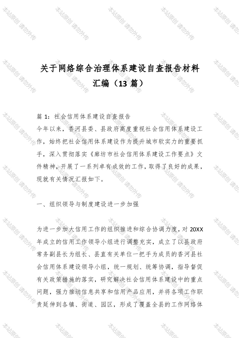 本站原创请勿外传本站原创请勿外传本站原创请勿外传本站原创请勿外传本站原创请本站原创请勿外传关于网络综合治理体系建设自查报告材料请勿外传汇编(13篇)请勿外传本站原创请本站原篇1:社会信用体系建设自查报告今年以来,香河县委、县政府高度重视社会信用体系建设工手,深入贯彻落实《廊坊市社会信用体系建设工作要点》文件精神,开展了一系列卓有成效的工作,取得了良好的成果,本站原创请勿外传现就有关情况汇报如下。青勿外传原创请勿外传原创请勿外传本站原创请勿一、组织领导与制度建设进一步加强本站原创请勿外传本立为进一步加大信用工作的组织推进和综合协调力度,对20XX本站原创请年成立的信用玉作领导小组进行调整充实,成立了以县政府务副县长为组长、县直有关单位一把手为成员的香河县社会信用体系建设领导小组,统一规划、统筹协调,指导督促有关政策猎施的落实,研究解决社会信用体系建设中的重点问题,强力推动信息共享和信用产品应用,并将各项红作职本站原本站原本站原本站原本站原创请勿外传本站原创本站原创请本站原创ク勿本站原创请勿。同时,根据《廊坊市社会信用体系建设工作要点》,先后出台了《香河县人民政府办公室关于印发香河县社会信用体系建设工作实施方案的通知》、《加强金融生态环境建设,本站原创请勿外传促进全县经济金融协调发展的意见》、《关于推广应用信用产品的实施意见》等文件,明确了信用体系建设的工作任务、工作目标、具体措施等,形成了较为完备、有香河特色的社会信用体系建设总体规划体系。本站原创请勿外传本站创二、信用信息报送等常规工作进步规范本站原创请勿外传本站原创请勿为加快社会信用体系建设,完善社会信用监管平台,县社会信用体系建设领导小组结合市政府通知精神多次召开工作协调会,明确要求相关单位必须严格按照《香河县人民政府法>的通知》精神,及时准确地对信用信息进行归集使用,本站原创请勿外定时更新信用数据库,确保信用建设和信息化数据准确性。县政府信用办已将此项工作列入年终考核,对于信用信息上本站原创请报不及时,工作拖沓,提供虚假信息的单位给予差评,并按照有关规定追究相关人员责任。同时,按照市政府通知要求,我县已与市政府专网实现了信息实时传输,各部门,各镇、本站原创请勿外传街道、园区的政府专网连接也正由相关部门进行设计规划,本站原创请准备在网络建成后实行轮训制度,每年定期对信息报送人本站原本站原本站原本站原创请勿外传本站原创请本站原创请ク本站原创请勿本站原创请勿员进行培训,以满足信息技术的更新和政务应用系统升级的需求。三、信用产品应用进一步深化本站原创请勿外传原创原创本站原创是在项目建设处。县委、县政府信用准入制度,在各财政融资建设项目的招投标活动中,严把企业信用关,坚决杜绝失信企业进入。并明确要求在履行经济调节、市场监管、社本站原创请勿外传会管理和公共服务等过程中使用信用报告,将信用产品作为土地使用权出徒投标、建设工程的招投标和政府采购等行为的重要参考依据。目前我县参与财政投融资建设项目的招标代理公司和投标单位,全部使用信用报告且中标企业均符合信用准入标准,确保了项目招投标的公开、公正、公平。创请勿タ请勿タ创请勿外本站原创请勿是在平台搭建。依托县工商局企业信息平台,建立健全全县企业信用记录平台,所有市场主体的登记、注销、吊销、本站原创请勿外年检、巡查及其他与信用有关的信息全部录入系统,自动生成信用等级【A级(守信标准)、B级(警示标准)、C级(失信标本站原创请准)、D级(严重失信标准)】,实行分类监管,严控重点、热点行业,并提供信用信息查询服务,共享各行各业的严重失信信息,建立“黑名单”制度,形成失信惩戒的联动监管约束本站原创请勿外传机制。原创请勿外传原创请勿外传原创请勿外传本站原创请勿