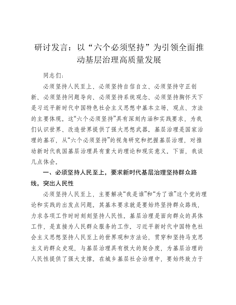 - 研讨发言:以“六个必须坚持”为引领全面推动基层治理高质量发展