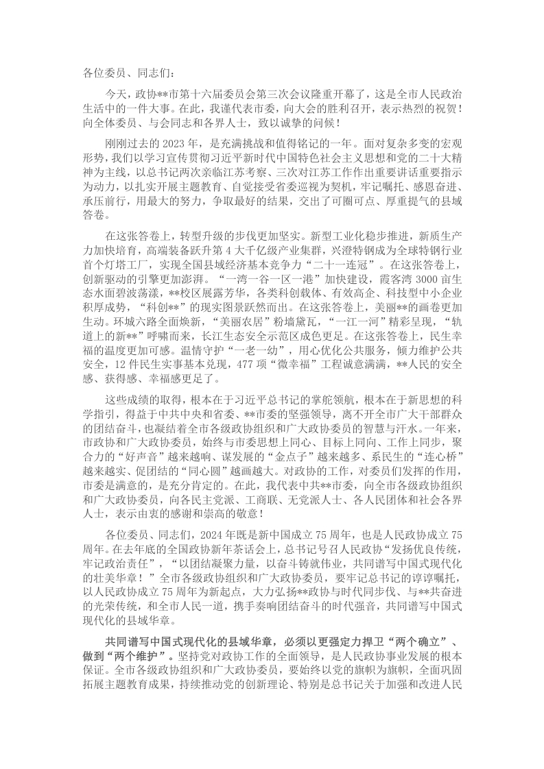 在2024年市政协三次会议开幕式上的讲话