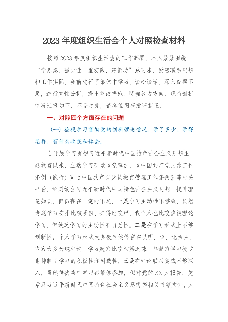 2023年度组织生活会个人对照检查材料四个方面