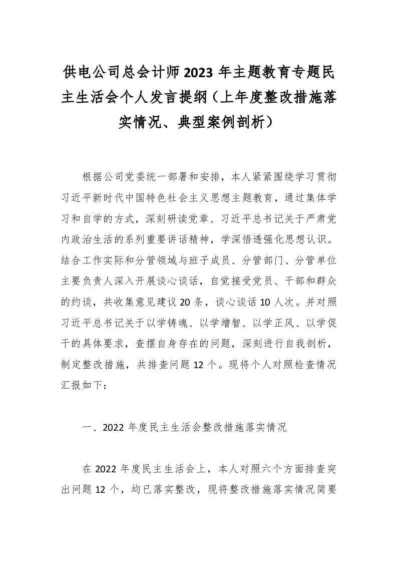首页写作素材供电公司总会计师2023年主题教育专题民主生活会个人发言提纲上年度整改措施落实情况、典型案例剖析