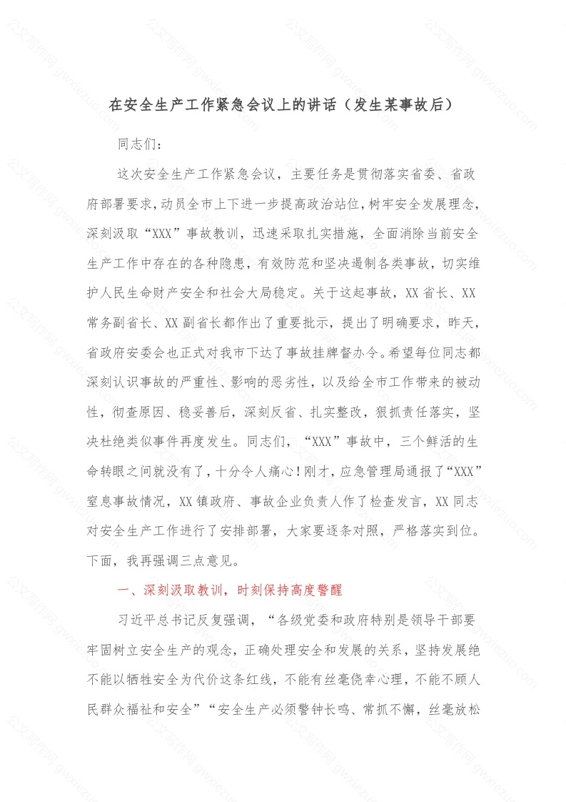 首页精选范文在安全生产工作紧急会议上的讲话(发生某事故后)