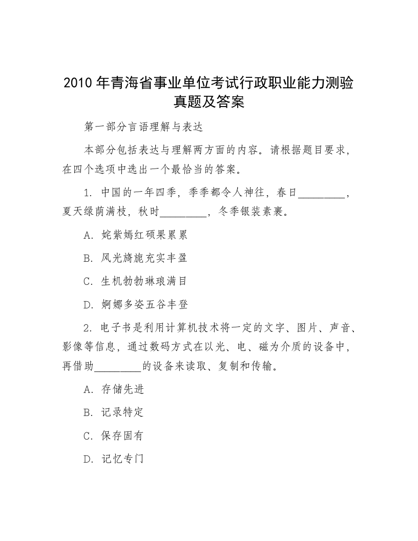 2010年青海省事业单位考试行政职业能力测验真题及答案