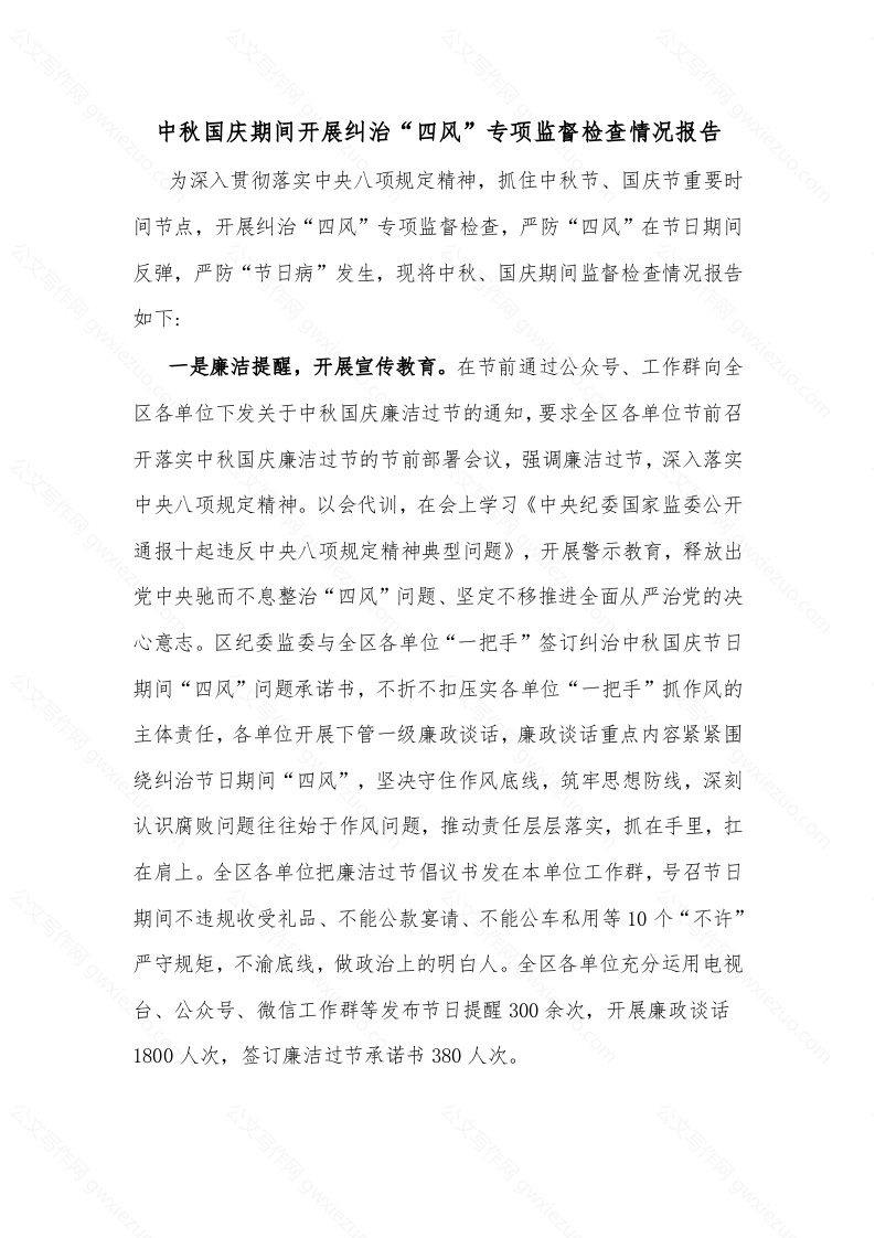 首页工作文档中秋国庆期间开展纠治“四风”专项监督检查情况报告