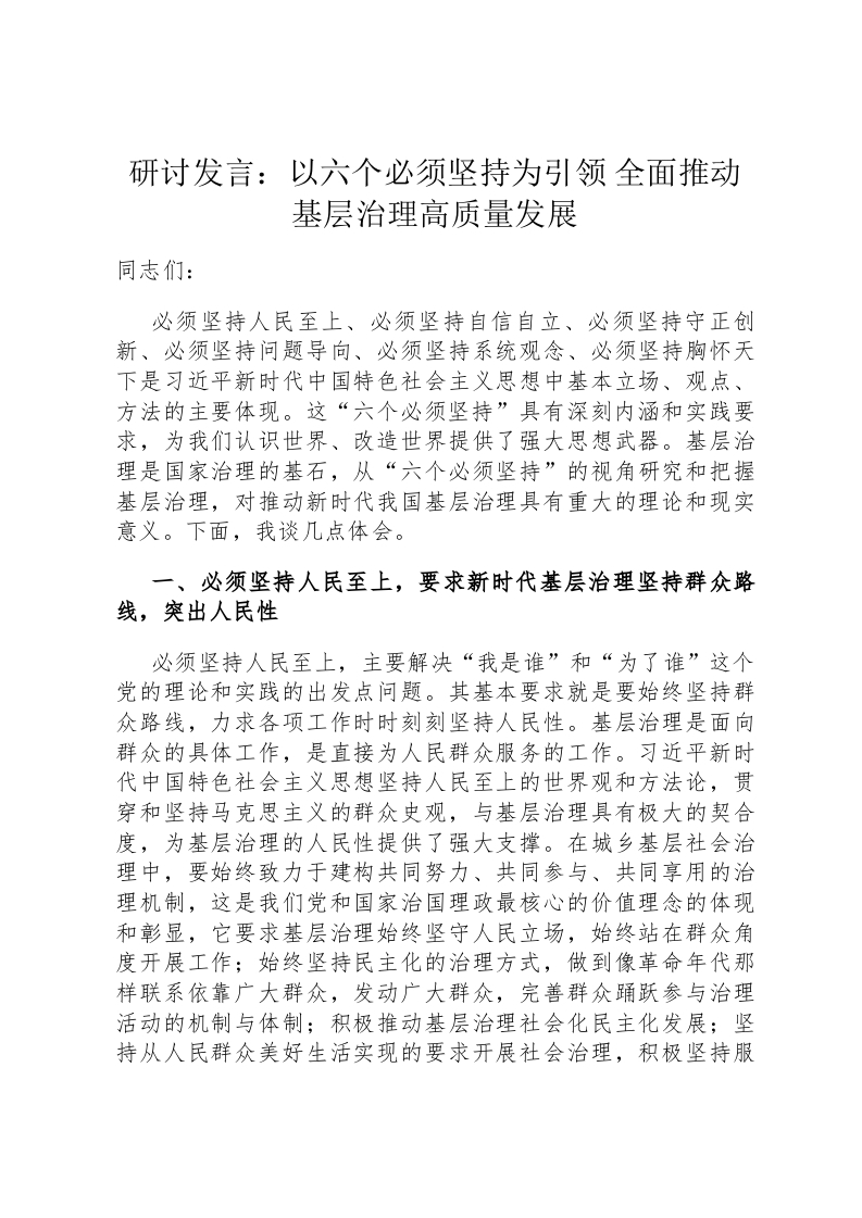 - 研讨发言:以“六个必须坚持”为引领全面推动基层治理高质量发展