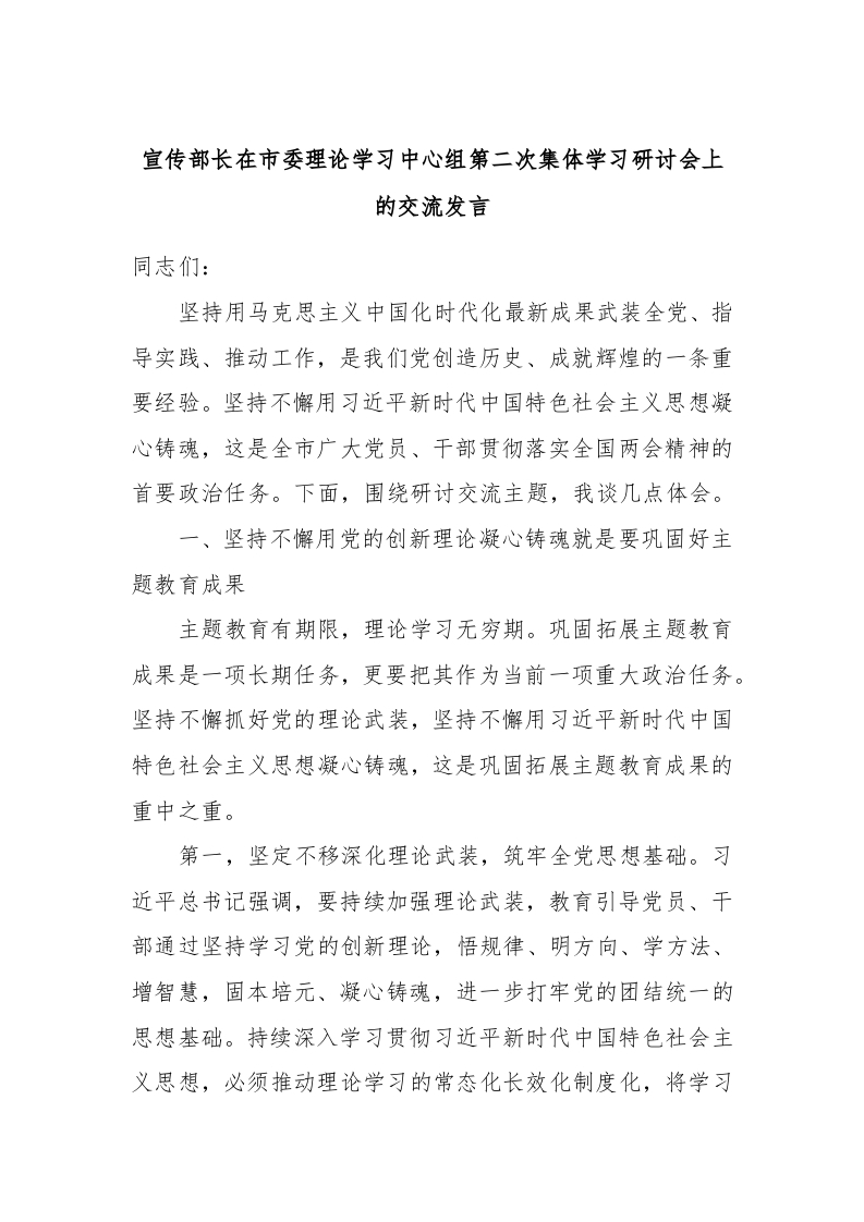 - 宣传部长在2024年市委理论学习中心组第八次集体学习研讨交流会上的发言