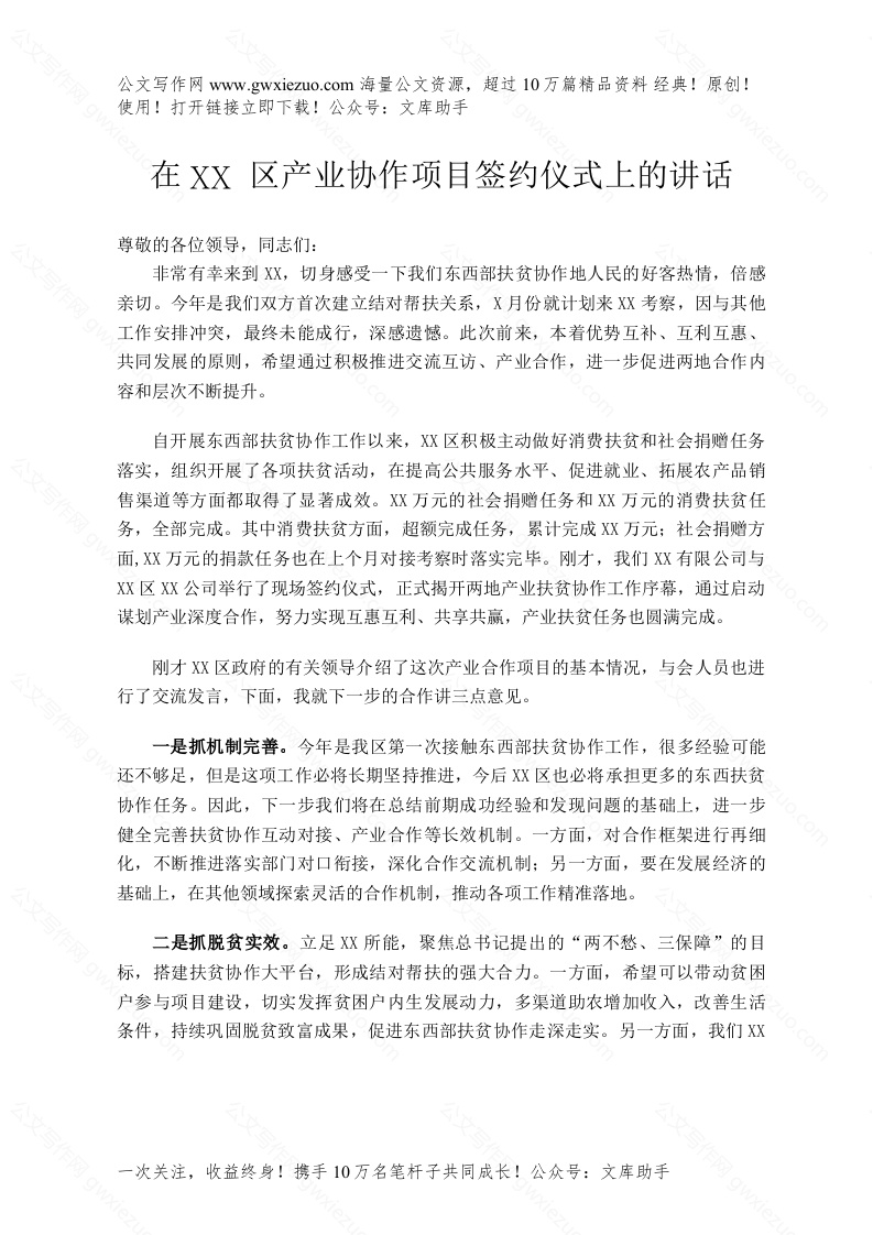 - 在XX区产业协作项目签约仪式上的讲话