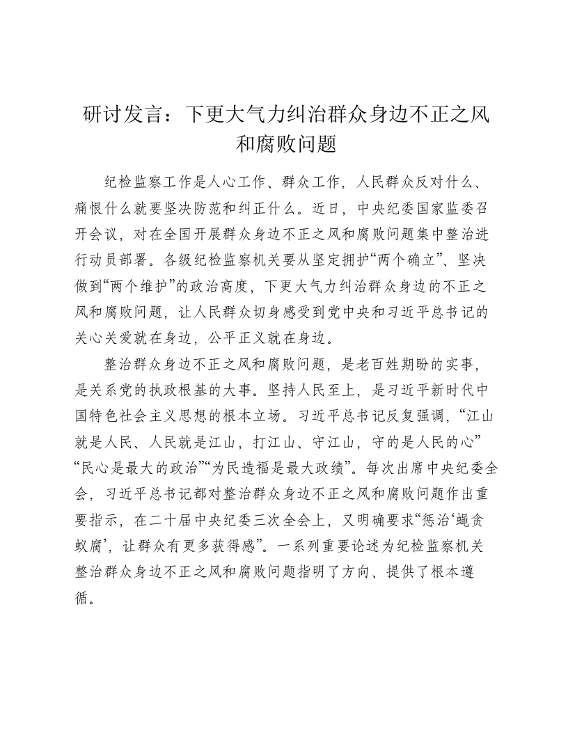 研讨发言:下更大气力纠治群众身边不正之风和腐败问题