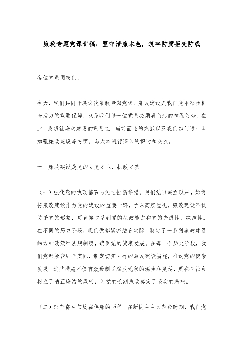 - 党课讲稿:坚守清廉本色,筑牢防腐拒变防线