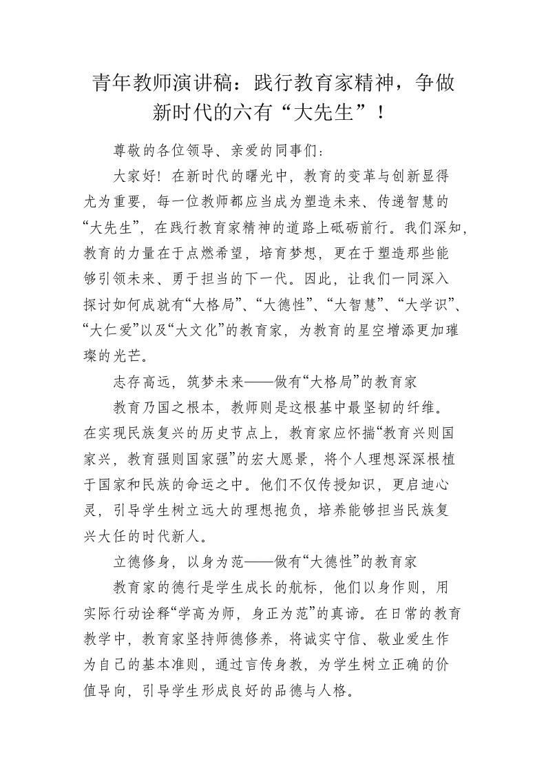 青年教师演讲稿:践行教育家精神,争做新时代的六有“大先生”!