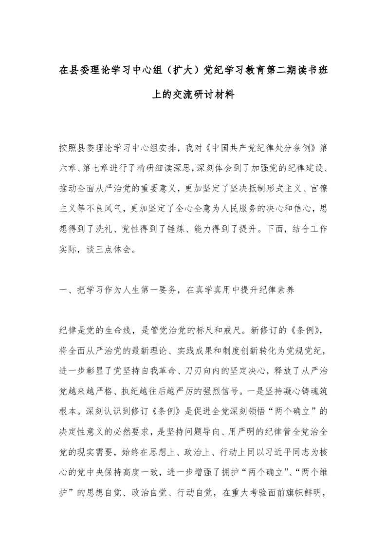 - 在县委理论学习中心组扩大党纪学习教育读书班上的交流研讨材料3 (1)