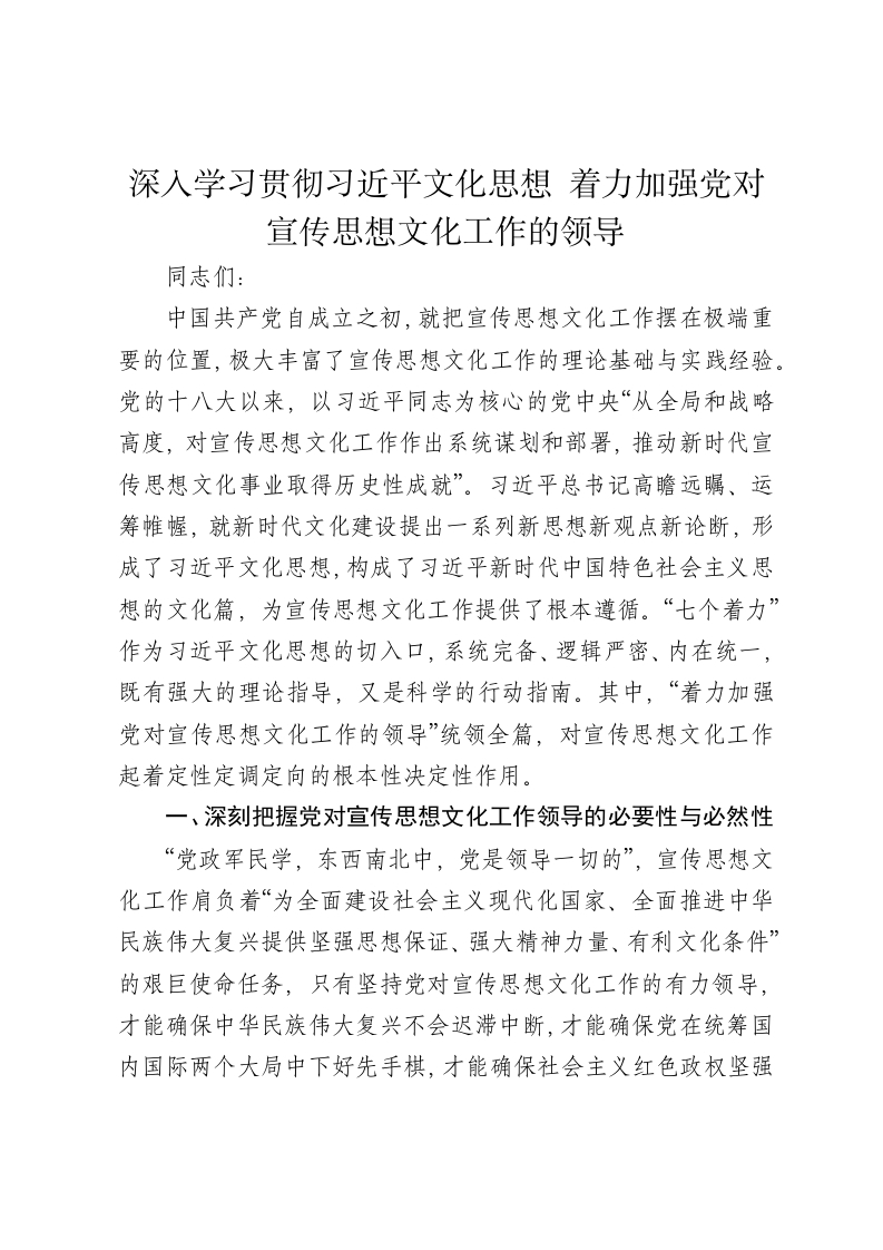 - 深入学习贯彻***文化思想 着力加强党对宣传思想文化工作的领导