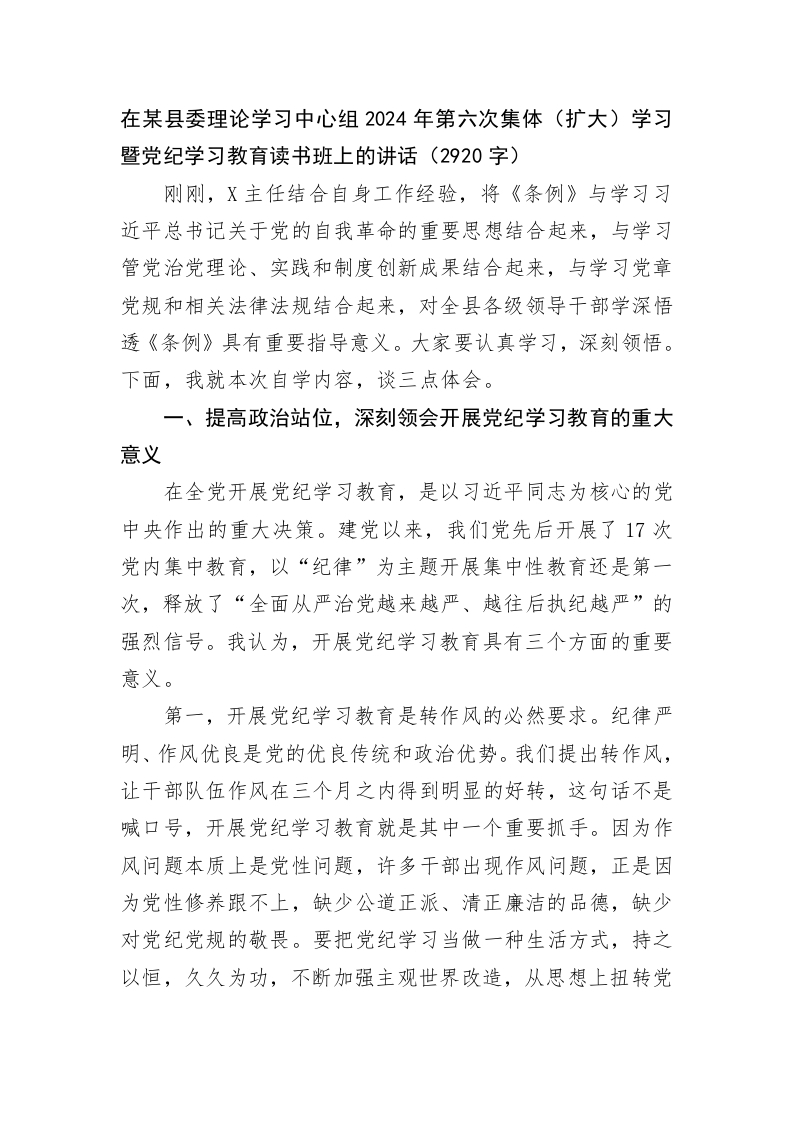 - 在某县委理论学习中心组2024年第六次集体扩大学习暨党纪学习教育读书班上的讲话