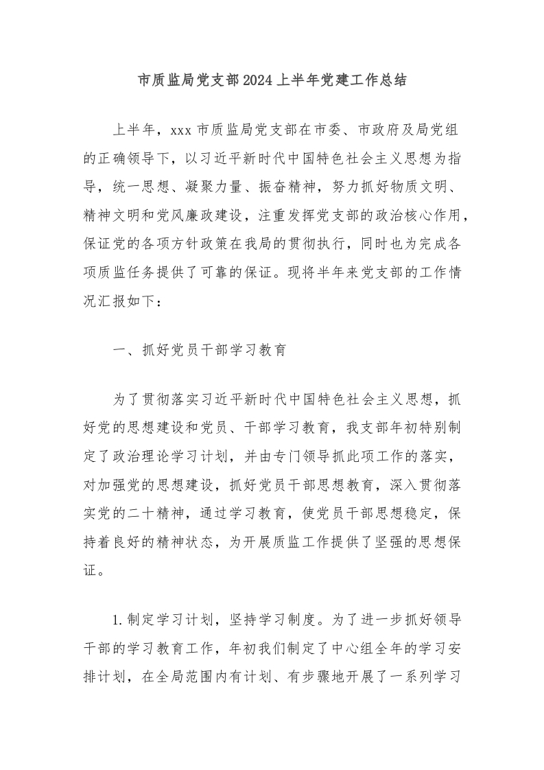 首页精选范文市质监局党支部2024上半年党建工作总结