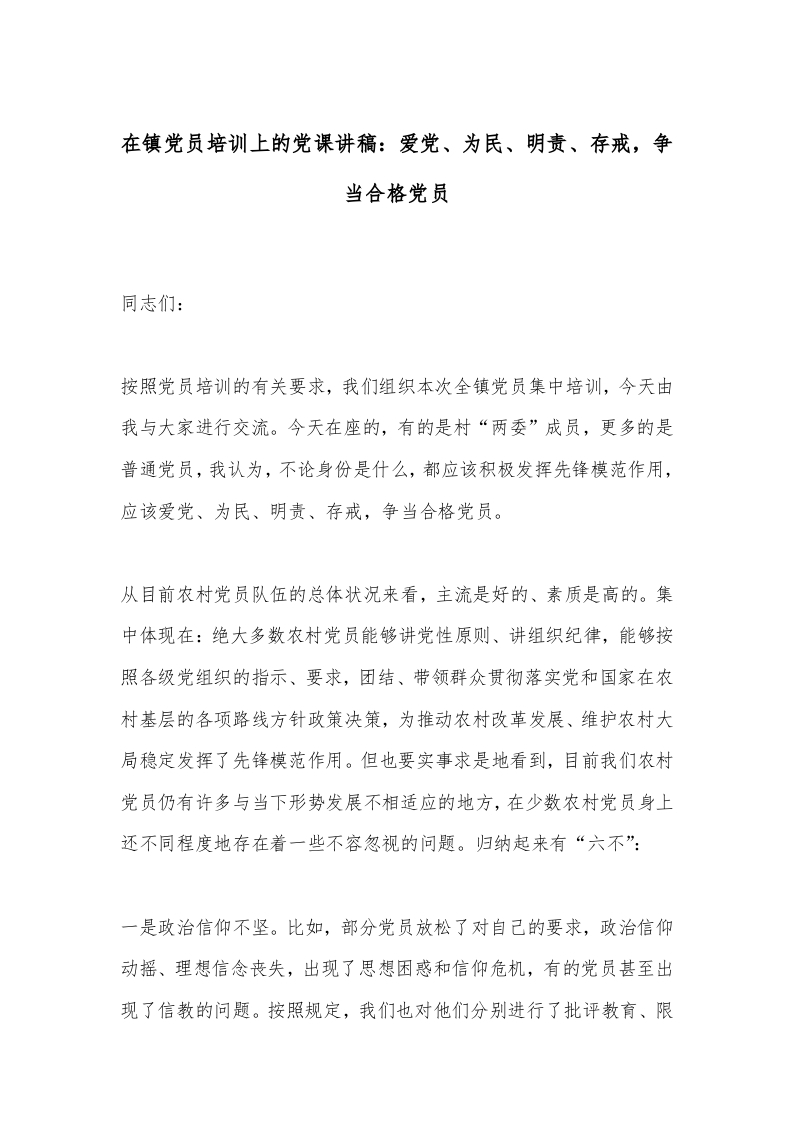 首页讲课讲稿在镇党员培训上的党课讲稿:爱党、为民、明责、存戒,争当合格党员