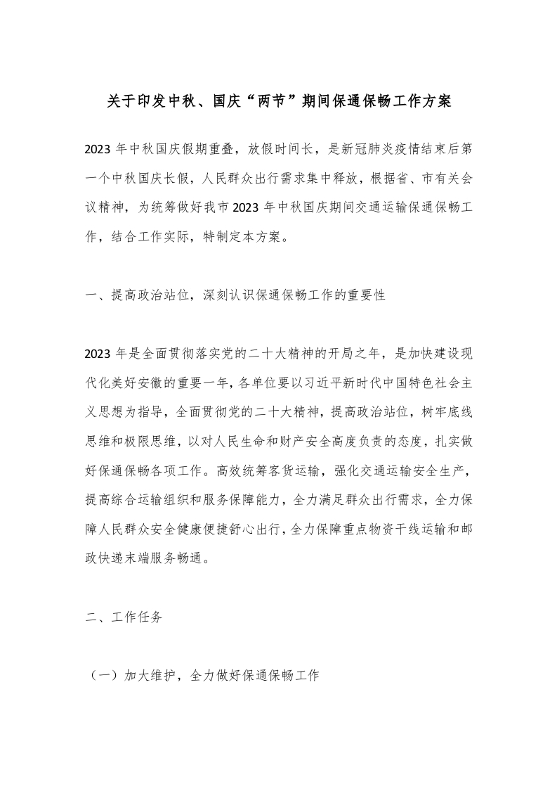 关于印发中秋、国庆“两节”期间保通保畅工作方案