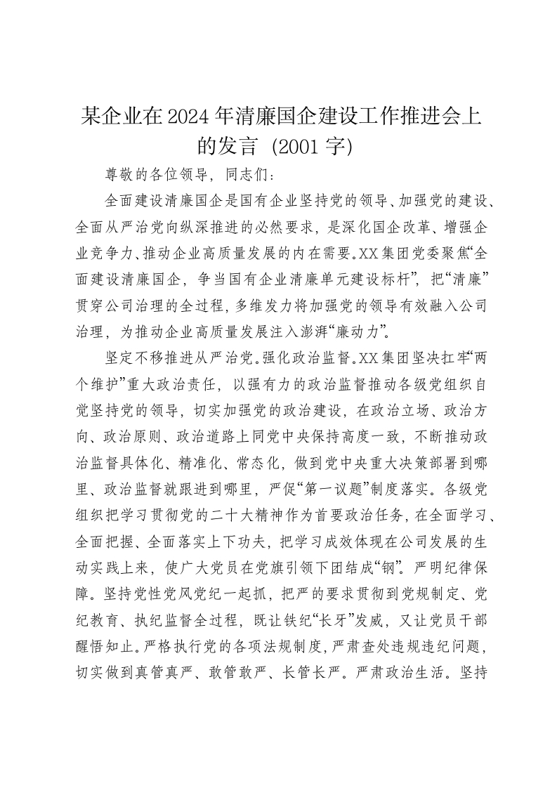 首页写作素材2024年清廉国企建设工作推进会上的发言2001字