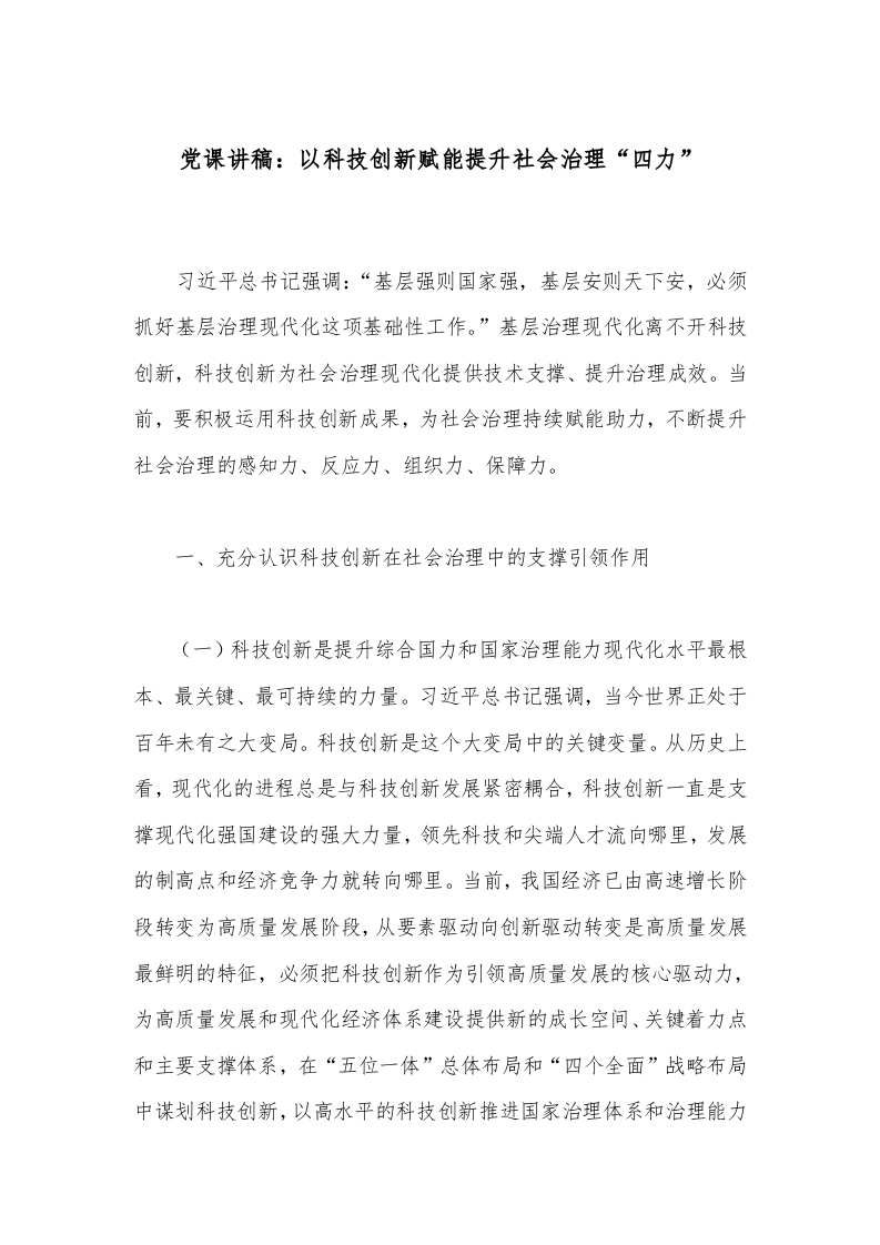 党课讲稿:以科技创新赋能提升社会治理“四力”