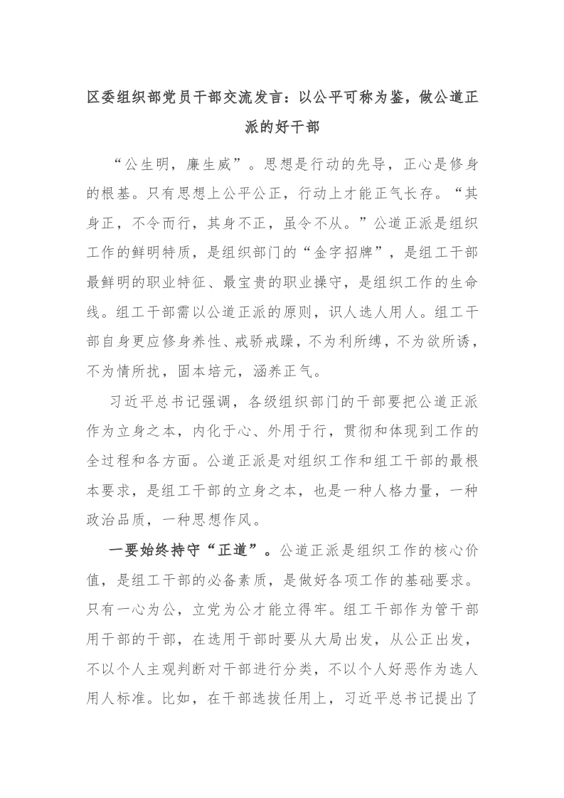 区委组织部党员干部交流发言:以公平可称为鉴,做公道正派的好干部部