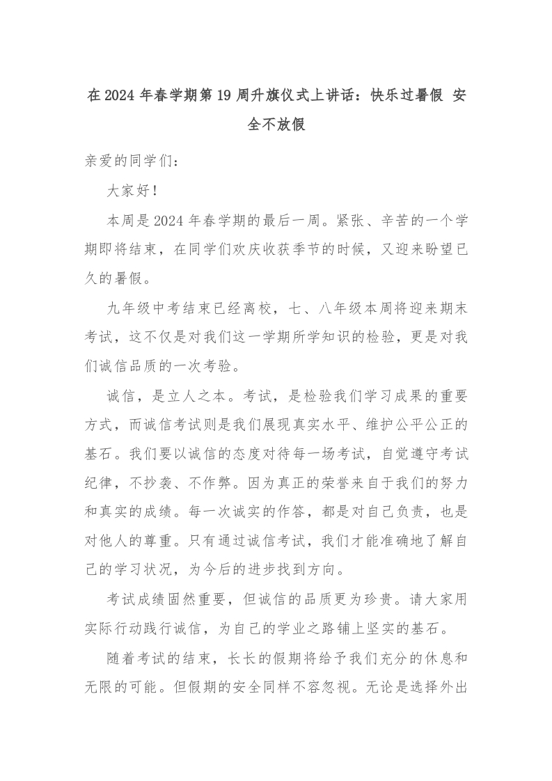 在2024年春学期第19周升旗仪式上讲话:快乐过暑假 安全不放假