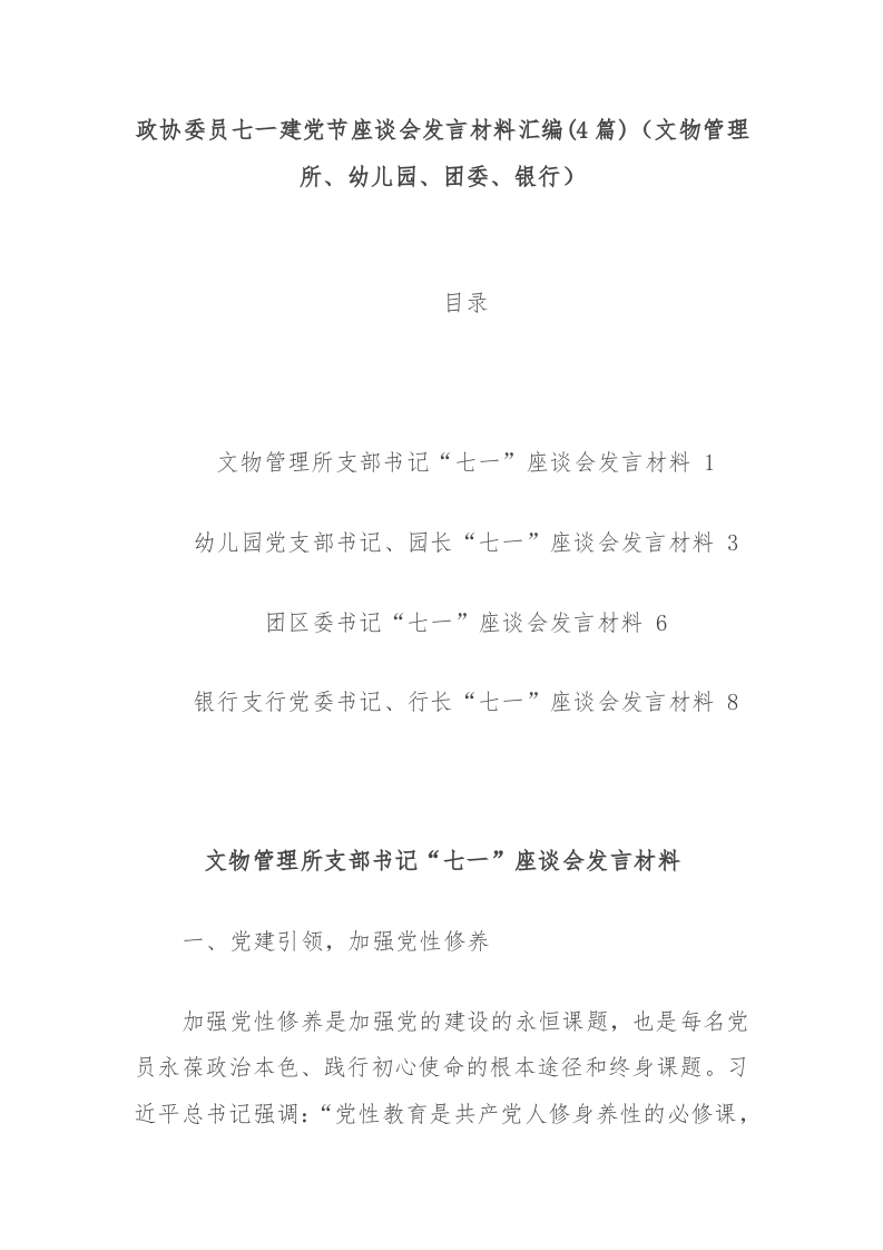 (4篇)政协委员七一建党节座谈会发言材料汇编文物管理所、幼儿园、团委、银行