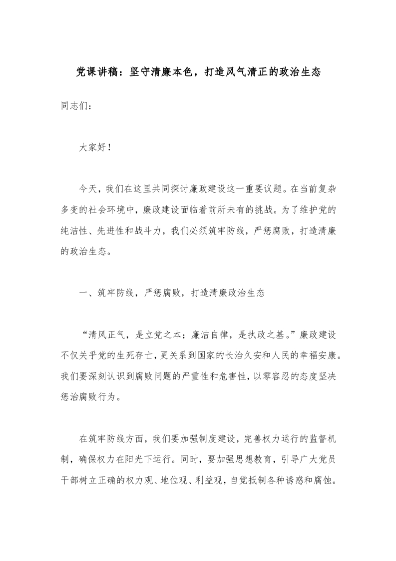 首页材料汇编党课讲稿:坚守清廉本色,打造风气清正的政治生态