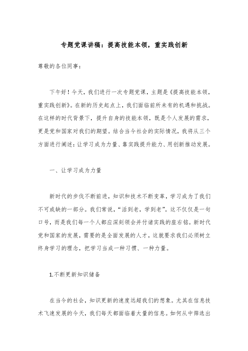 首页材料汇编专题党课讲稿:提高技能本领,重实践创新