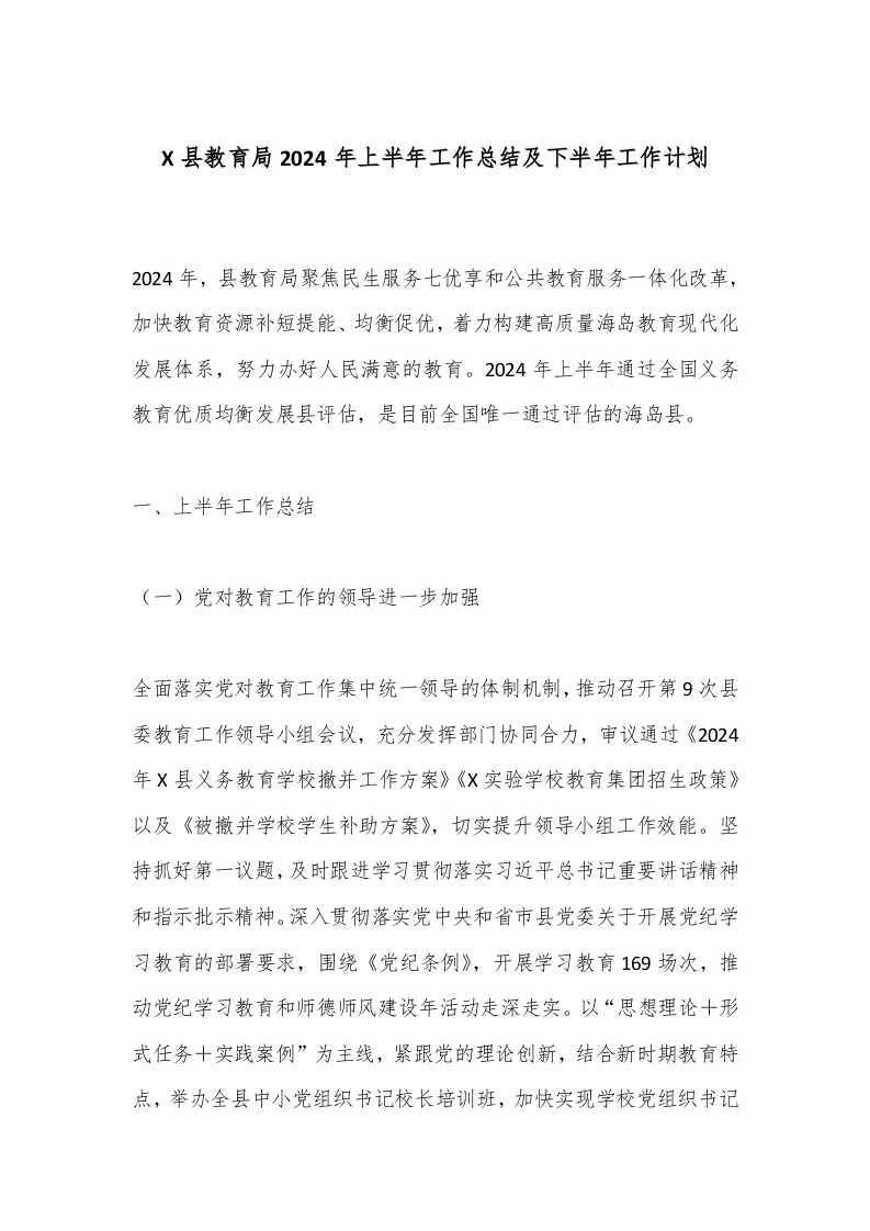 X县教育局2024年上半年工作总结及下半年工作计划