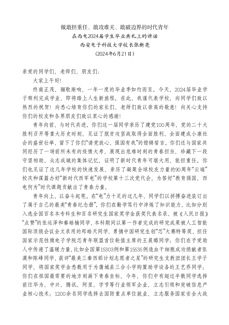 最新讲话系列11000西安电子科技大学校长张新亮:在西电2024届学生毕业典礼上的讲话