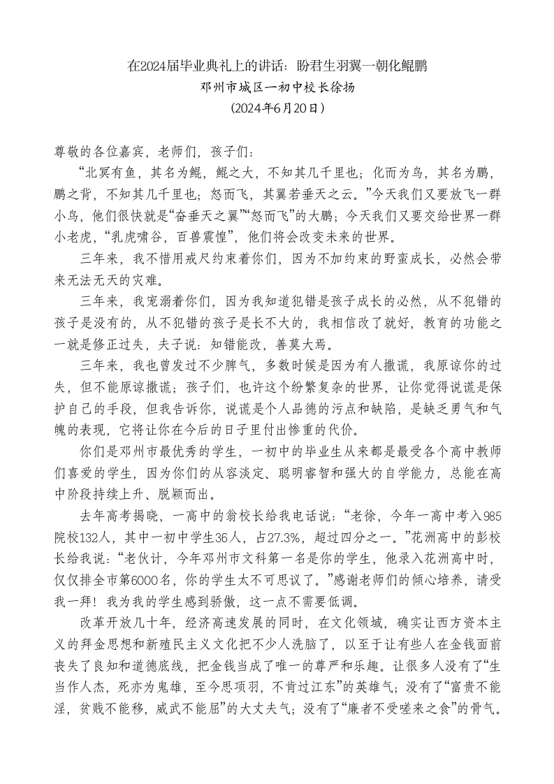 最新讲话系列11002邓州市城区一初中校长徐扬:在2024届毕业典礼上的讲话:盼君生羽翼一朝化鲲鹏