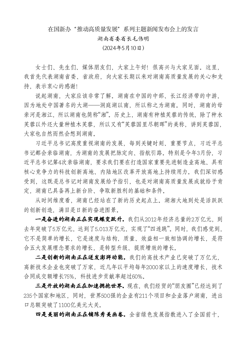 最新讲话系列10888湖南省委省长毛伟明:在国新办“推动高质量发展”系列主题新闻发布会上的发言