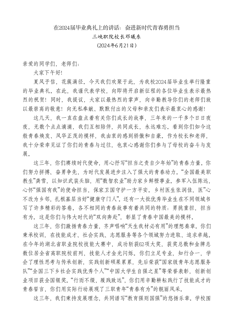 最新讲话系列10915三峡职院校长邓曦东:在2024届毕业典礼上的讲话:奋进新时代青春勇担当