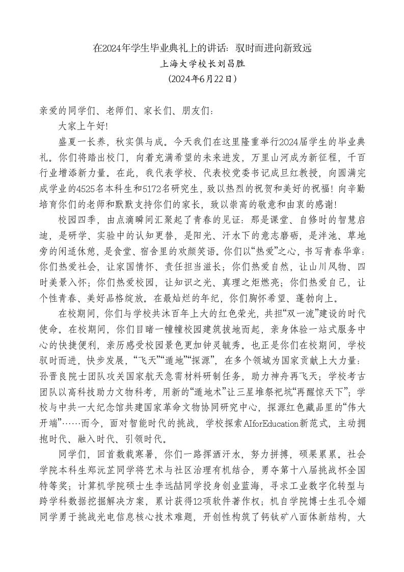 最新讲话系列10918上海大学校长刘昌胜:在2024年学生毕业典礼上的讲话:驭时而进向新致远