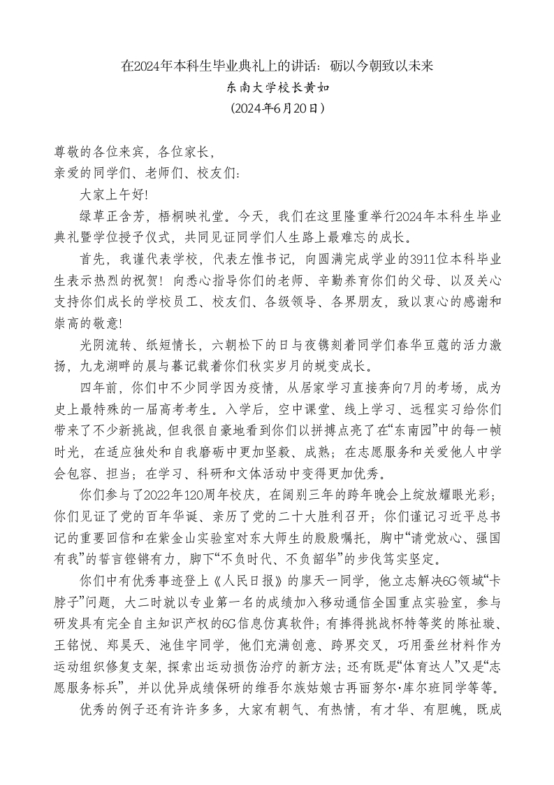 最新讲话系列10922东南大学校长黄如:在2024年本科生毕业典礼上的讲话:砺以今朝致以未来
