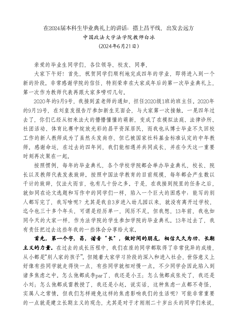 最新讲话系列10927中国政法大学法学院教师白冰:在2024届本科生毕业典礼上的讲话:搭上昌平线,出发去远方