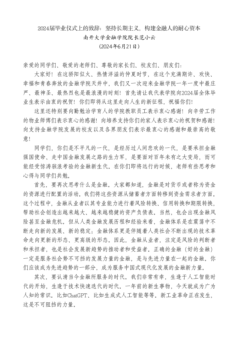 最新讲话系列10941南开大学金融学院院长范小云:2024届毕业仪式上的致辞:坚持长期主义,构建金融人的耐心资本