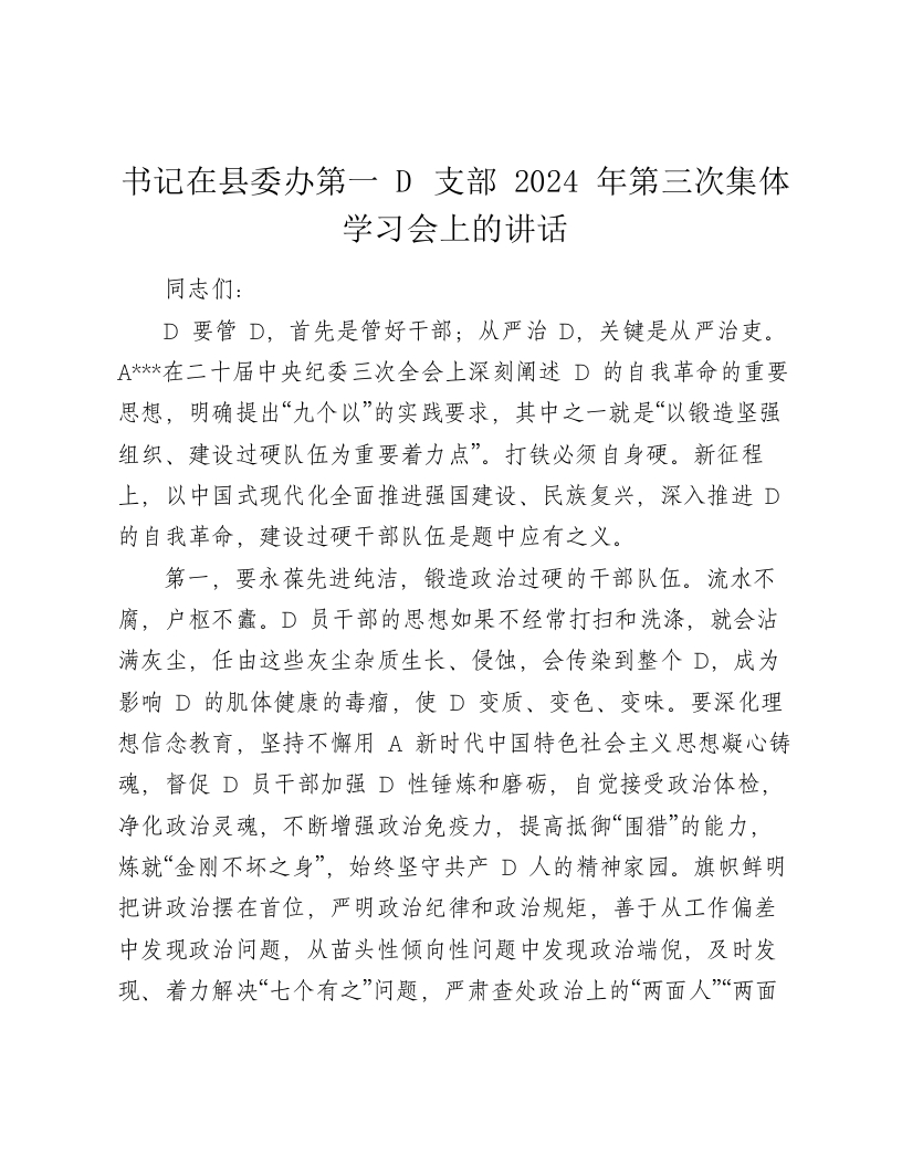 书记在县委办第一党支部2024年第三次集体学习会上的讲话