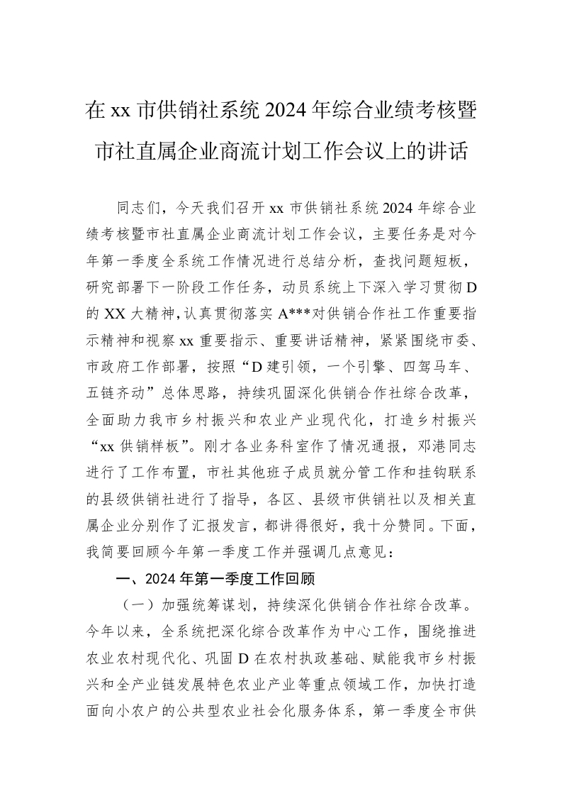 在xx市供销社系统2024年综合业绩考核暨市社直属企业商流计划工作会议上的讲话