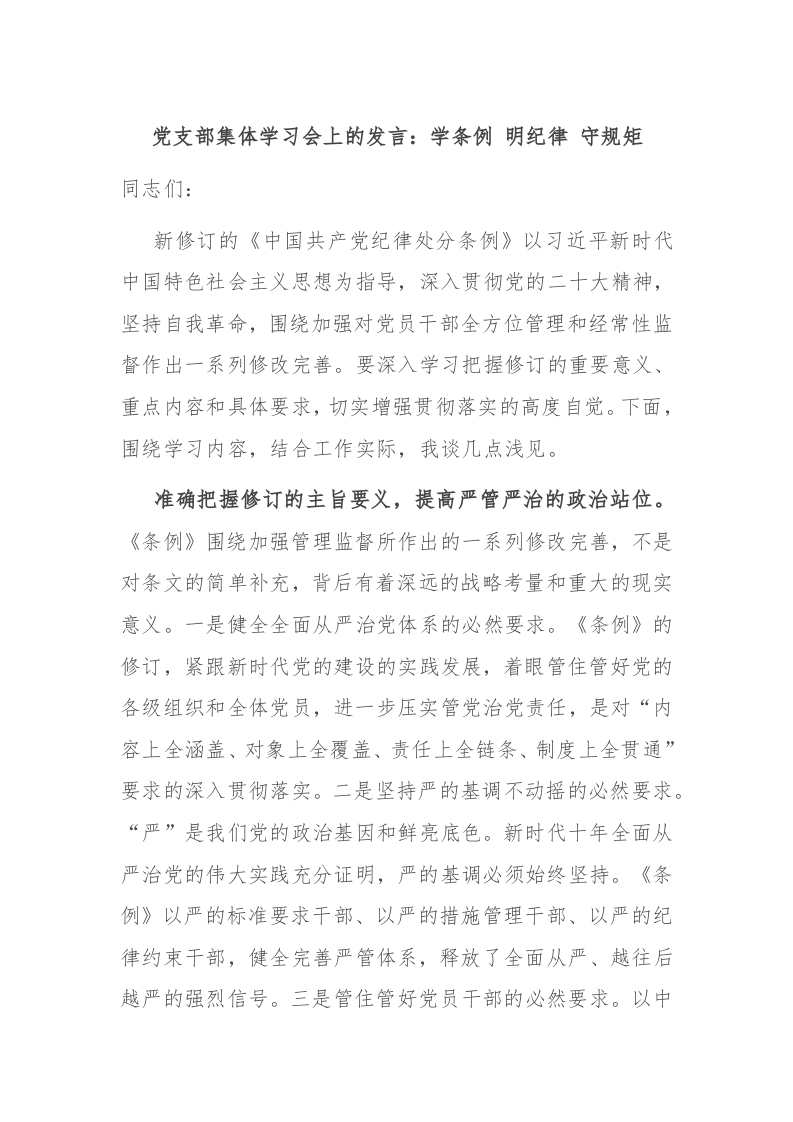 首页精选范文党支部集体学习会上的发言:学条例 明纪律 守规矩