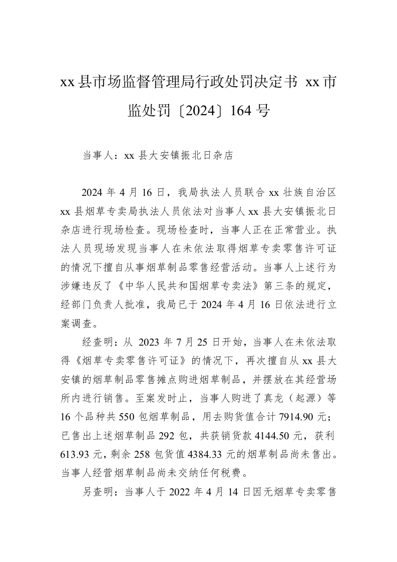 xx县市场监督管理局行政处罚决定书 xx市监处罚〔2024〕164号