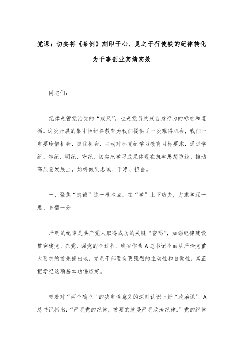 党课:切实将《条例》刻印于心、见之于行使铁的纪律转化为干事创业实绩实效