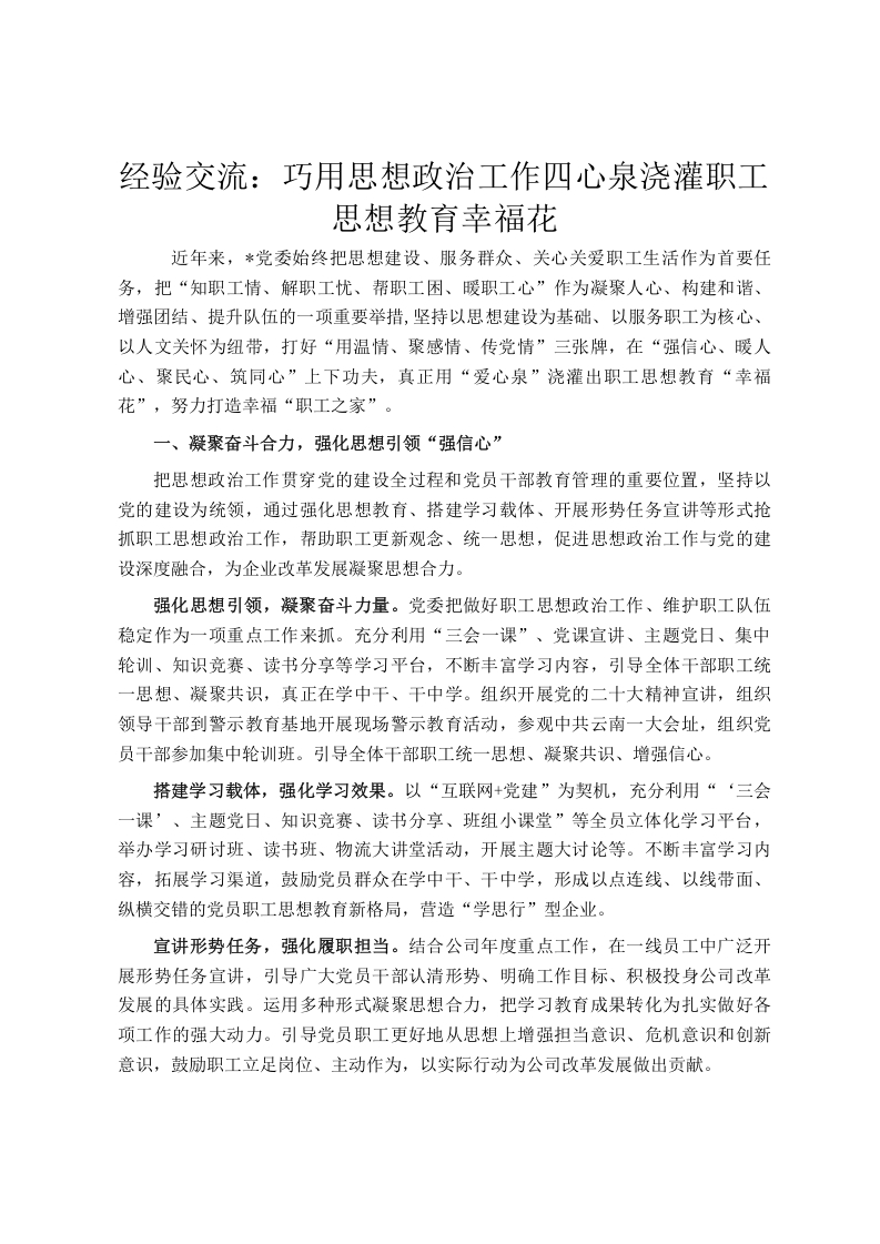 经验交流:巧用思想政治工作四心泉浇灌职工思想教育幸福花