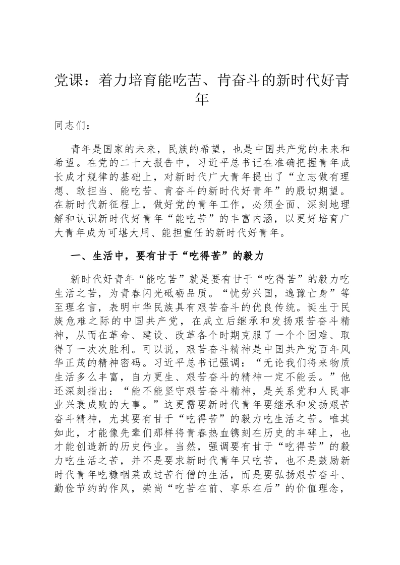 党课:着力培育能吃苦、肯奋斗的新时代好青年